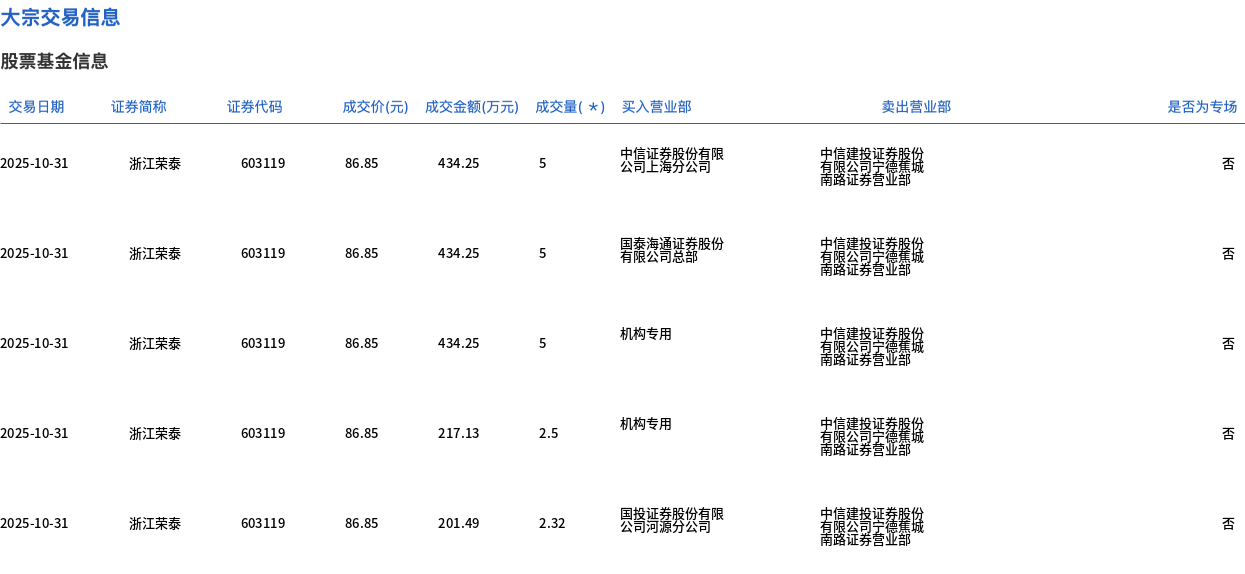 10月31日,浙江荣泰大宗交易成交19.82万股,成交额1721.37万元,占当日总成交额的0.87%,成交价86.85元,较市场收盘价100.29元折价13.4%。