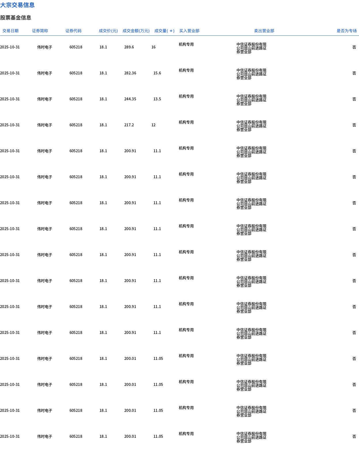 10月31日,伟时电子大宗交易成交190.1万股,成交额3440.83万元,占当日总成交额的46.97%,成交价18.1元,较市场收盘价20.34元折价11.01%。