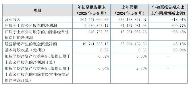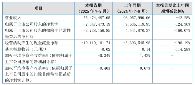 三季度单季业绩表现更为严峻。报告显示,2025年第三季度,公司营业收入5547.45万元,较上年同期的9605.80万元同比下滑42.25%;归母净利润由上年同期的盈利963.61万元转为亏损234.75万元;扣非归母净利润为亏损272.82万元,同样由盈转亏。