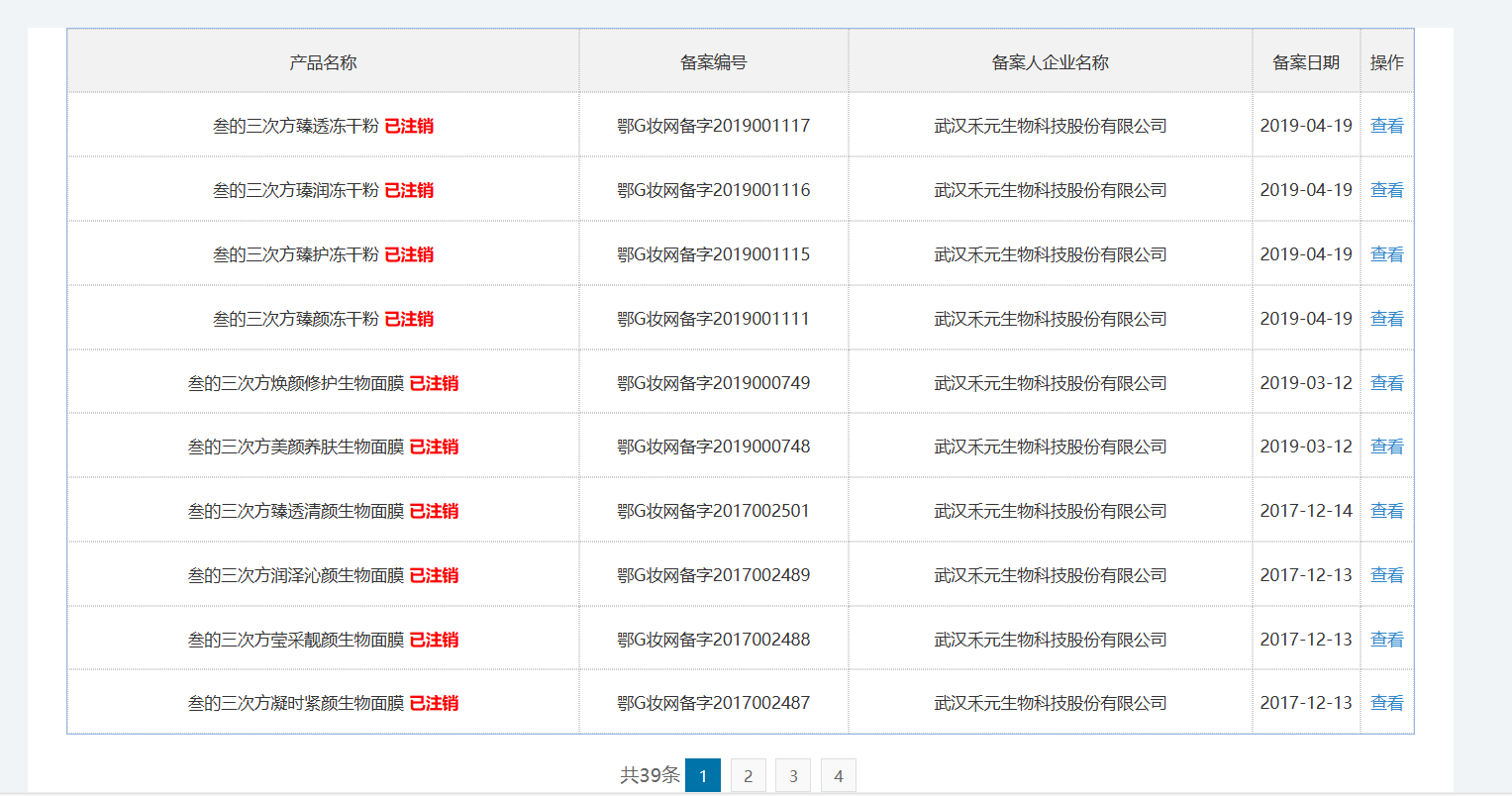 目前,叁的三次方品牌在国家普通化妆品备案信息平台的39条产品备案均已注销。
