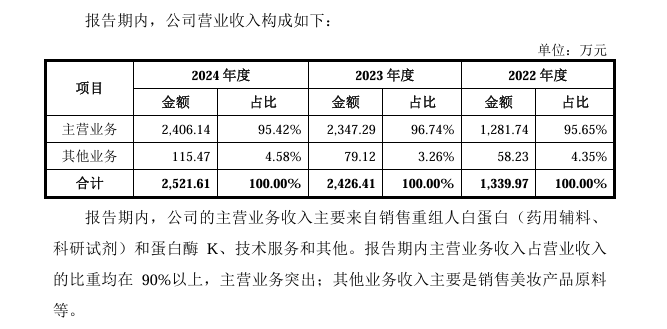 据禾元生物招股书披露,公司的主营业务收入主要来自销售重组人白蛋白(药用辅料、科研试剂)和蛋白酶K、技术服务和其他;其他业务收入则主要是销售美妆产品原料等,不过,该业务2022年至2024年的营收分别为58.23万元、79.12万元以及115.47万元,占据总营收的比重均不足5%。