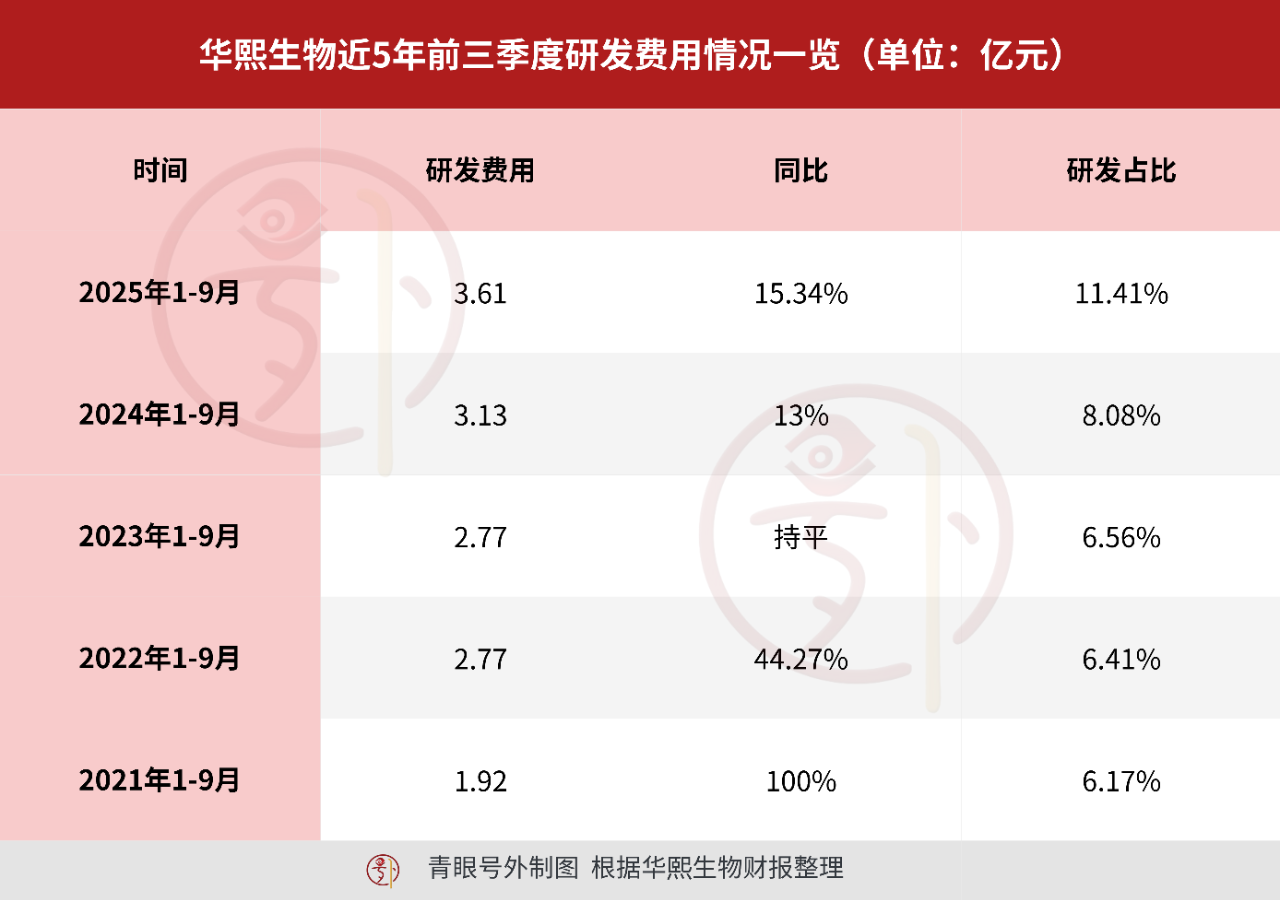 尽管业绩持续下滑,但华熙生物却并没有缩减在研发领域的投入。财报显示,该公司在今年前三季度的研发费用为3.61亿元,同比增长15.34%,研发占比高达11.41%。