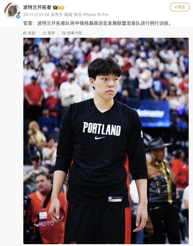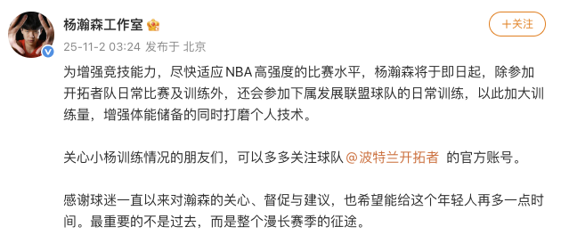 北京时间11月2日凌晨,美职篮(NBA)波特兰开拓者队官宣,将中锋杨瀚森派至发展联盟混音队进行例行训练。随后,杨瀚森工作室发文称,“为增强竞技能力,尽快适应NBA高强度的比赛水平,杨瀚森将于即日起,除参加开拓者队日常比赛及训练外,还会参加下属发展联盟球队的日常训练,以此加大训练量,增强体能储备的同时打磨个人技术。”