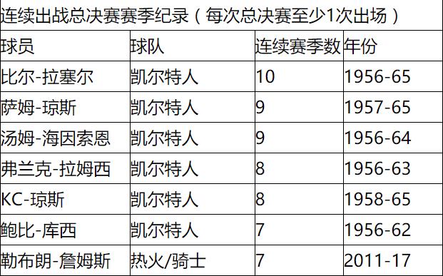 勒布朗-詹姆斯将成为联盟历史第7位连续7个赛季闯入总决赛并有出场记录的球员。此前6位球员全部都是1950年代以及1960年代凯尔特人的成员:
