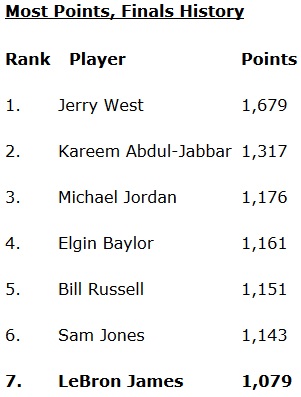詹姆斯在总决赛历史得分榜排名第7位。他还需要得到98分就可以超越迈克尔-乔丹跻身前三,前两位是杰里-韦斯特和卡里姆-阿卜杜尔-贾巴尔。目前詹姆斯在季后赛得分榜上已经超越乔丹成为季后赛得分王。以下是总决赛得分榜具体排名: