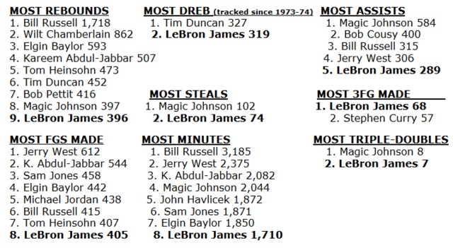 詹姆斯将出战生涯第8次总决赛(他的总决赛首秀在2007年)。联盟史上只有6位球员出战总决赛系列赛次数超过詹姆斯:比尔·拉塞尔12次,萨姆·琼斯11次,卡里姆·阿卜杜尔·贾巴尔10次,汤姆·海因索恩9次,“魔术师”约翰逊9次以及杰里·韦斯特9次。