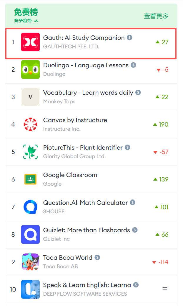 从下载量来看,字节跳动的产品断层式领跑,出海产品Gauth下载量675万,面向国内的豆包爱学下载量为481万,并且两者的环比增长都超过100%。而这也被认为是字节跳动本身的流量优势带来的成效。