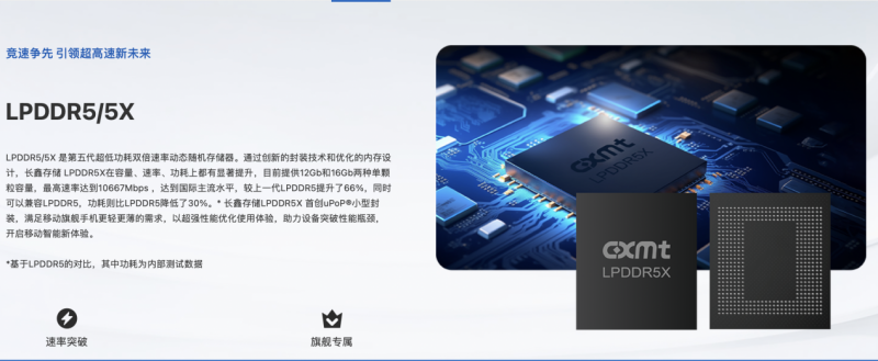 长鑫官网页面信息介绍,“LPDDR5/5X 是第五代超低功耗双倍速率动态随机存储器。通过创新的封装技术和优化的内存设计,长鑫存储 LPDDR5X在容量、速率、功耗上都有显著提升,目前提供12Gb和16Gb两种单颗粒容量,最高速率达到10667Mbps ,达到国际主流水平,较上一代LPDDR5提升了66%,同时可以兼容LPDDR5,功耗则比LPDDR5降低了30%。“