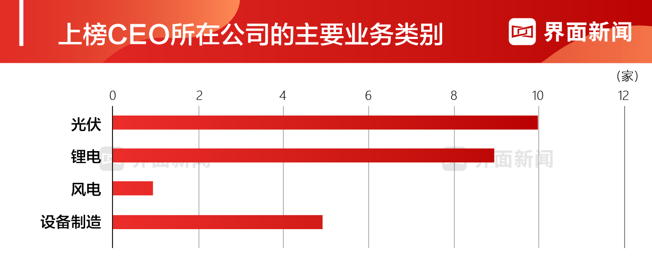 从上榜CEO所在公司的主营业务来看,以光伏相关业务为主的公司占比最多,共有10家;主营锂电相关的公司有9家;另外,还有5家主营设备制造、1家主营风电相关业务。