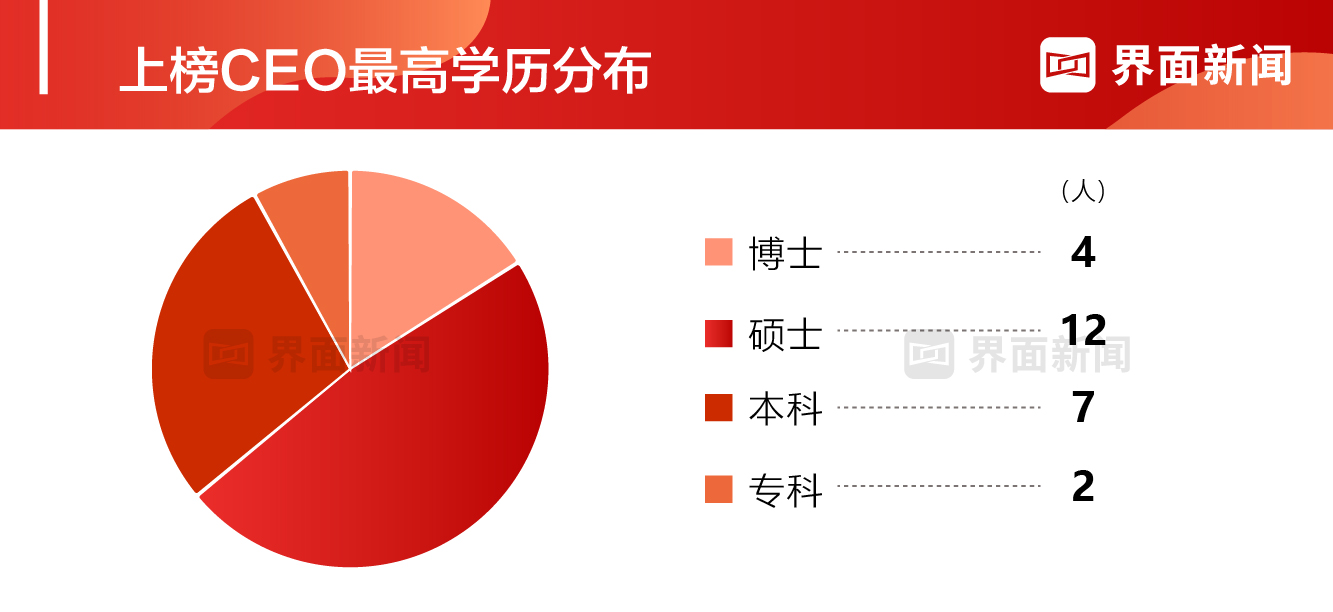 新能源领域作为知识密集型与技术密集型产业,高程度依赖科技创新水平与制造业发展水平。对企业而言,高管的学历背景也备受关注。25位上榜CEO中,最高学历为硕士及以上的有16人,占比64%,其中硕士12人,博士4人。