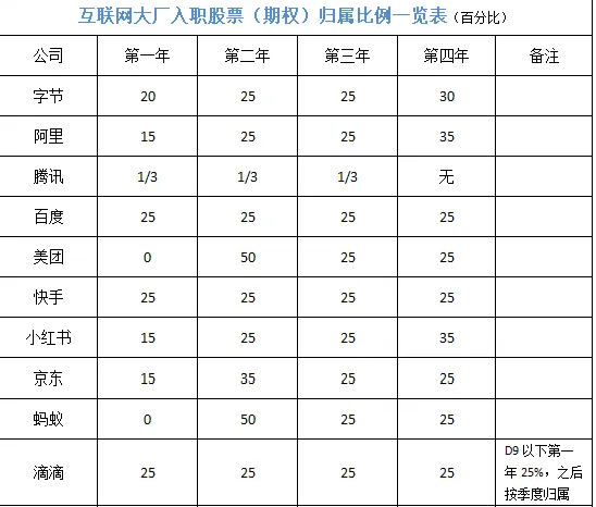 腾讯则是入职时只给3年股票,3年各归属1/3。快手和百度是每年归属25%。美团目前仍按照0,50%,25%,25%的形式归属,总体来说都是拉长了期限,鼓励员工待得越久激励越高。
