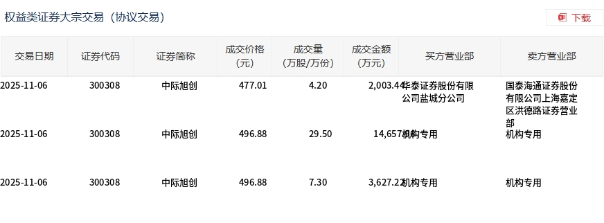 11月6日,中际旭创大宗交易成交41万股,成交额2.03亿元,占当日总成交额的1.09%,成交均价494.84元,较市场收盘价496.88元折价0.41%,其中最高成交价496.88元,最低成交价477.01元。