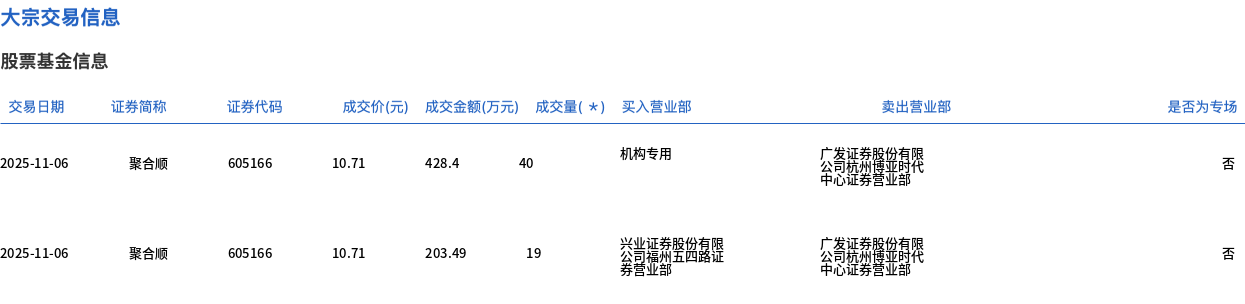 11月6日,聚合顺大宗交易成交59万股,成交额631.89万元,占当日总成交额的6.22%,成交价10.71元,较市场收盘价11.58元折价7.51%。