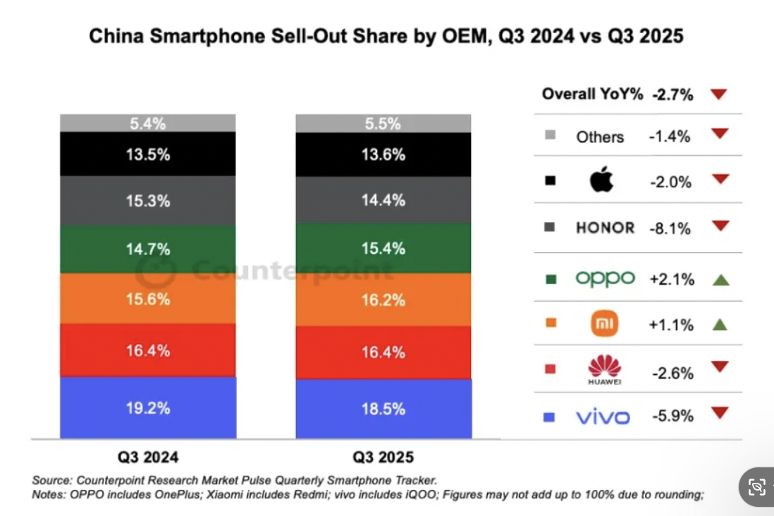 不过,随着新机型搭载的鸿蒙操作系统NEXT尚在完善阶段,应用数量和适配性仍待提升,这在一定程度上影响了消费者的购买决策。三季度,华为市场份额与去年同期持平,为16.4%,销量下滑2.6%。