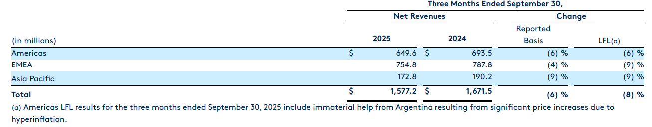 在亚太地区,净收入按LFL计算下降9%,反映了大多数市场的疲软。