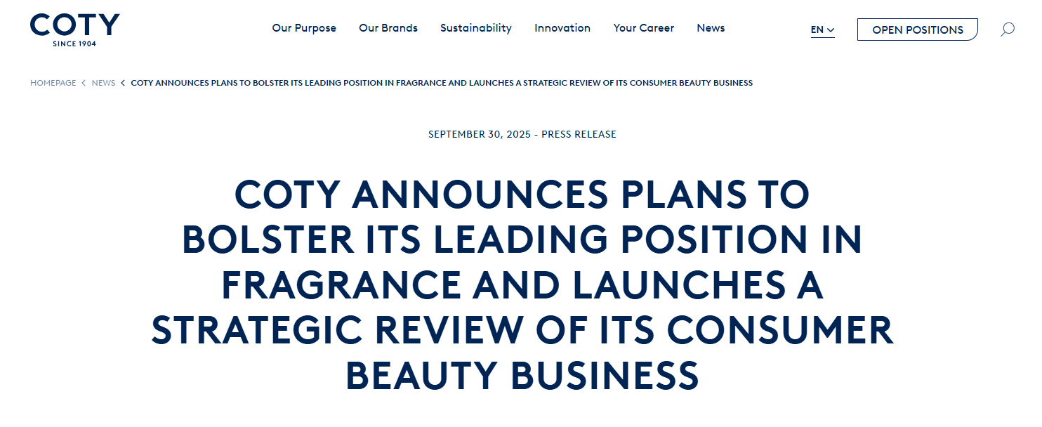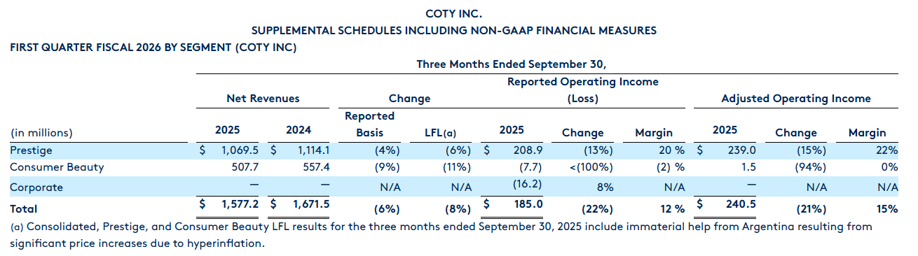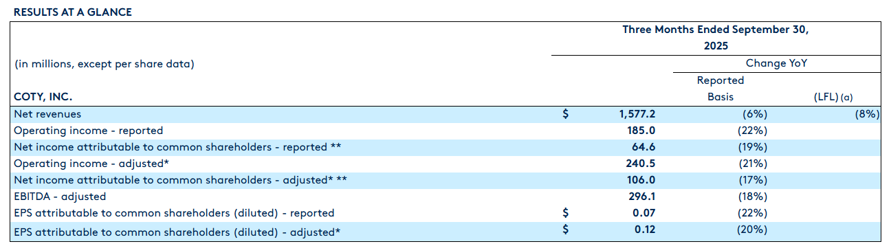 近日,全球美妆巨头科蒂(Coty)集团公布了其2026财年第一季度(截至2025年9月30日)的财务业绩。报告显示,本季度科蒂的整体交付符合预期,但财务数据呈现短期压力。