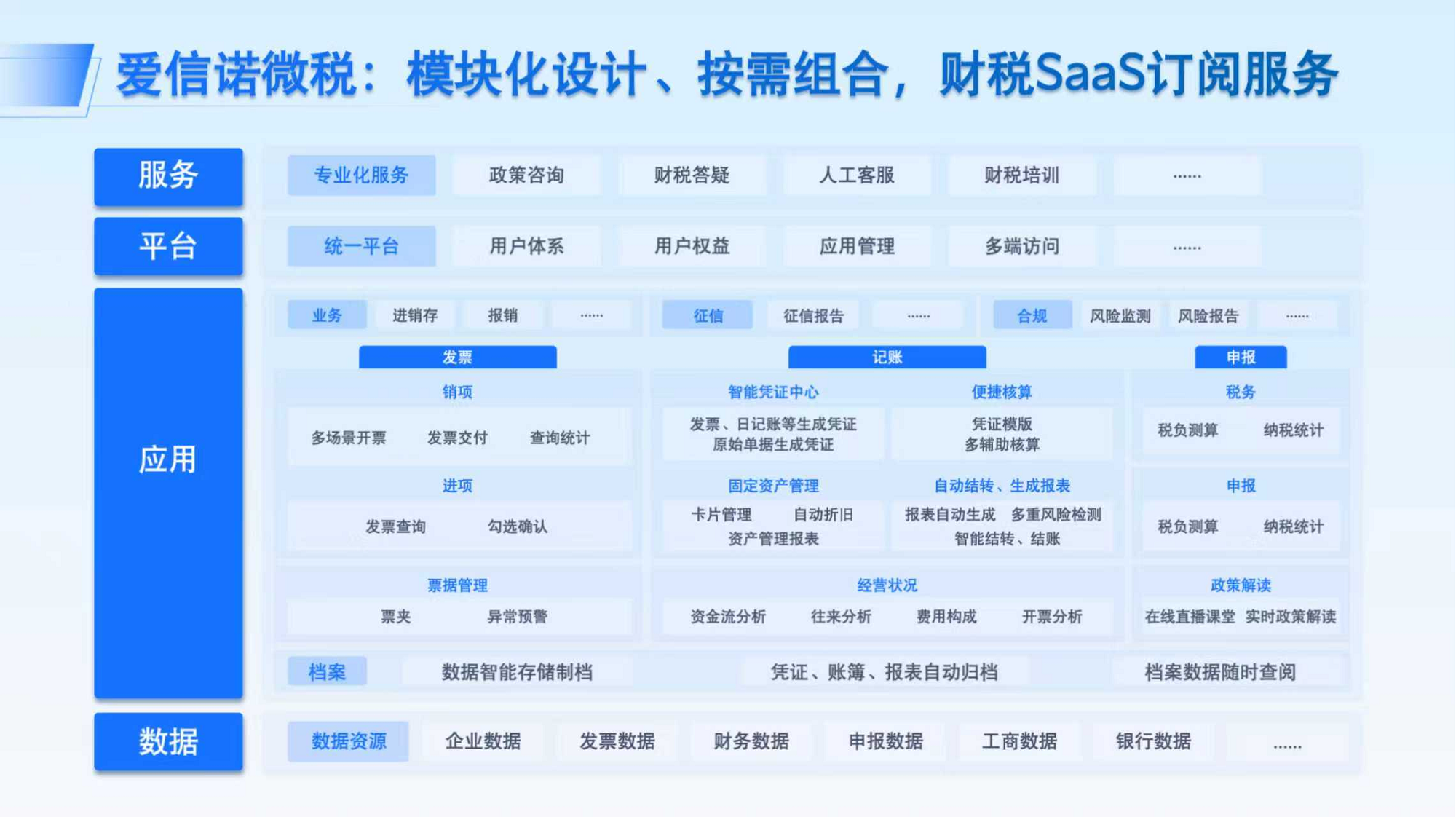 为解决小微企业财税管理手工做账效率低、合规风险高、成本压力大等痛点,爱信诺微税秉持“平台+产品+服务”理念,采用自研财税垂直领域信诺大模型,推出模块化智能财税解决方案。小微企业可像“拼积木”一样自由组合发票、记账、申报、档案、合规等功能模块。移动端APP、小程序支持随时随地开票查数,网页端实现批量处理,API接口则助力平台服务商拓展功能,真正让小微企业“用得起、用得懂、用得安心”。