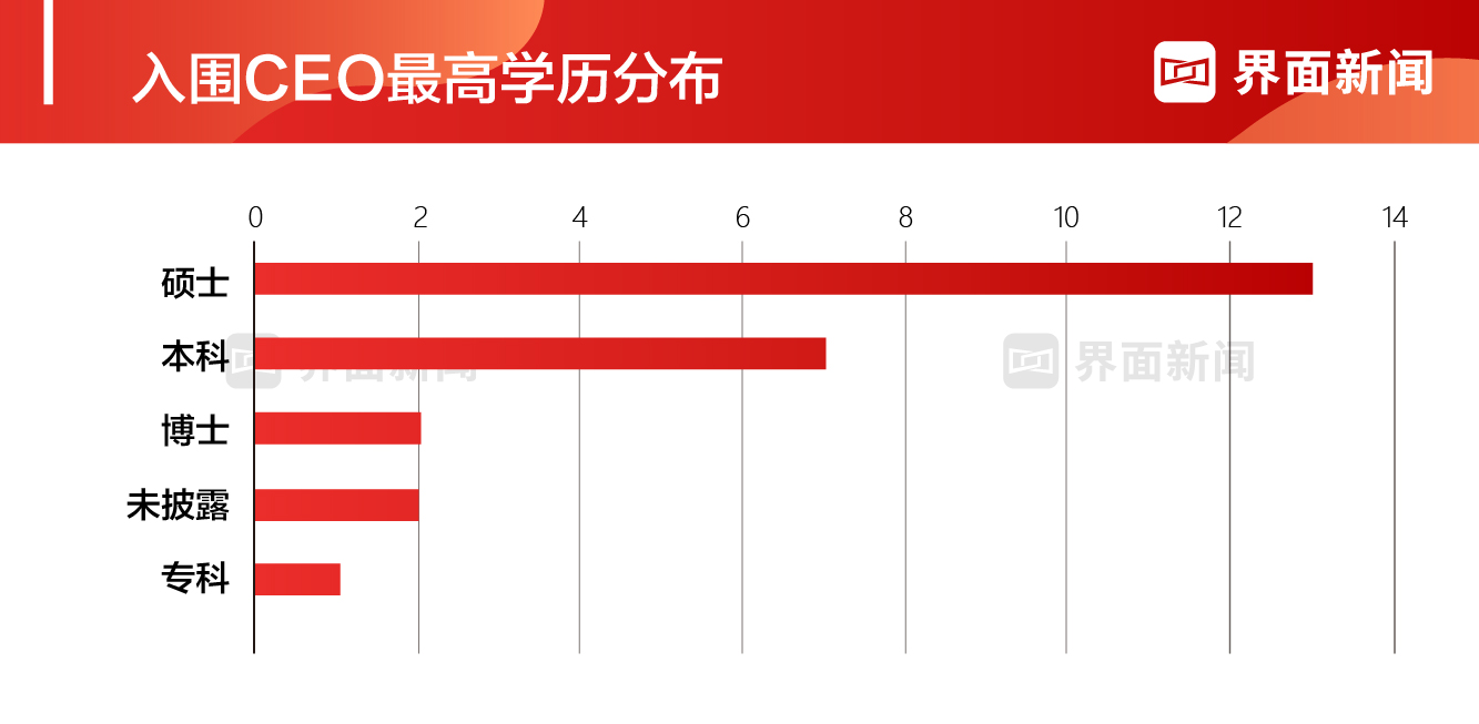 在25位上榜的CEO中,硕士和博士相加超过半数,高学历仍然是CEO的标配。其中,有13位公开了最高学历相关专业,大部分皆与经济或管理相关,由此可见,专业的事情需要专业的人去做。