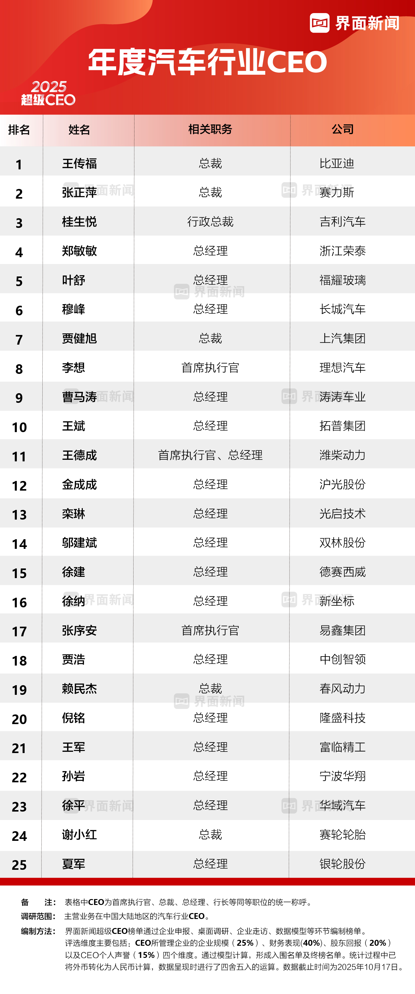 在2025年度汽车行业CEO榜单上,有25位CEO上榜,其中比亚迪董事长兼总裁王传福列榜首,宁德时代董事长兼总经理曾毓群排第二,吉利汽车行政总裁桂生悦第三。