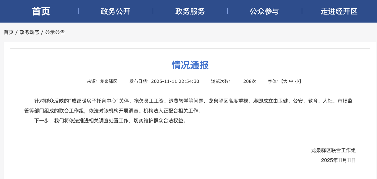 成都龙泉驿区联合工作组11月11日通报,针对群众反映的“成都暖房子托育中心”关停、拖欠员工工资、退费转学等问题,龙泉驿区高度重视,赓即成立由卫健、公安、教育、人社、市场监管等部门组成的联合工作组,依法对该机构开展调查。机构法人正配合相关工作。