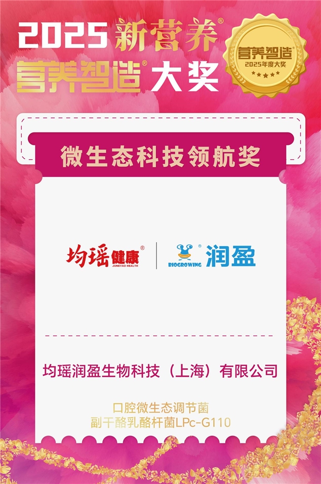 近日,均瑶润盈在微生态健康领域再添殊荣——旗下自研核心菌株副干酪乳酪杆菌LPc-G110凭借突出的健康价值与市场潜力,成功摘得「2025营养智造®微生态科技领航奖」。这一奖项由行业权威平台「新营养」发起设立,专门表彰在新营养产业供应链及全产业链中积极创新、贡献卓著的企业,标志着均瑶润盈的科研实力与产品理念获得业内认可,进一步巩固了其在口腔益生菌赛道的领先地位。