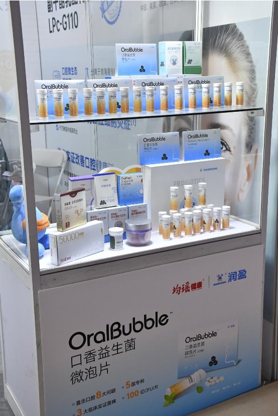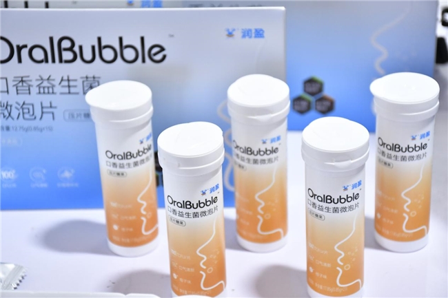 演讲现场,刘亮霆博士也向观众介绍了均瑶润盈今年发布的口腔健康产品——OralBubble™口香益生菌微泡片,凭借多元优势成为展会焦点。该产品创新性集结副干酪乳酪杆菌LPc-G110、植物乳植杆菌Lp-G18、唾液联合乳杆菌LS-G60三大核心菌株,每片高活性菌粉添加量达100亿CFU,同时复配山梨糖醇、异麦芽酮糖醇等益生元成分,通过菌株与益生元的协同作用,全方位覆盖口气异味、牙龈炎、龋齿、口腔溃疡等八大口腔健康痛点,实现口腔微生态的综合调节。