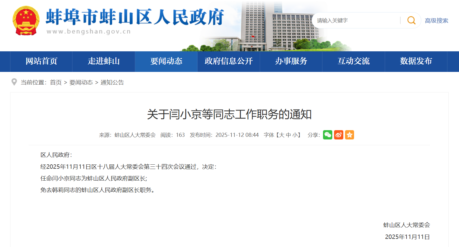 据蚌埠市蚌山区人民政府官网消息,2025年11月11日蚌埠蚌山区十八届人大常委会第三十四次会议通过人事事项,决定任命闫小京同志为蚌山区人民政府副区长;免去韩莉同志的蚌山区人民政府副区长职务。