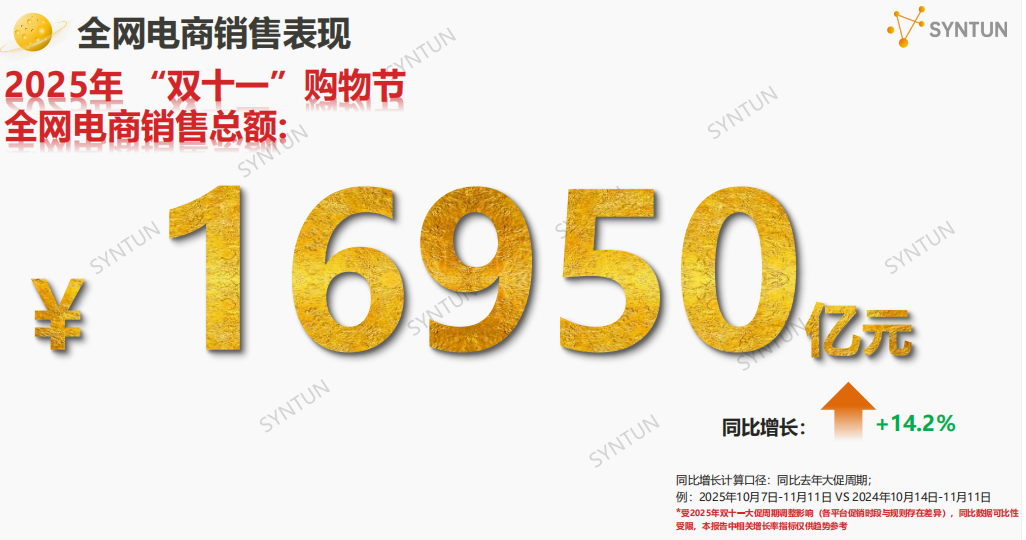 星图数据显示,2025年双11期间(10月7日-11月11日,综合电商检测平台:天猫、京东、拼多多等,抖音、快手已突破内容边界,也跻身综合电商阵营;即时零售检测平台:美团闪购、淘宝闪购、京东秒送、盒马等),全网销售总额16950亿元,同比增长14.2%(注:受今年双11大促周期调整影响,各平台促销时段与规则存在差异,同比数据可比性受限,本文中相关增长率指标仅供趋势参考)。