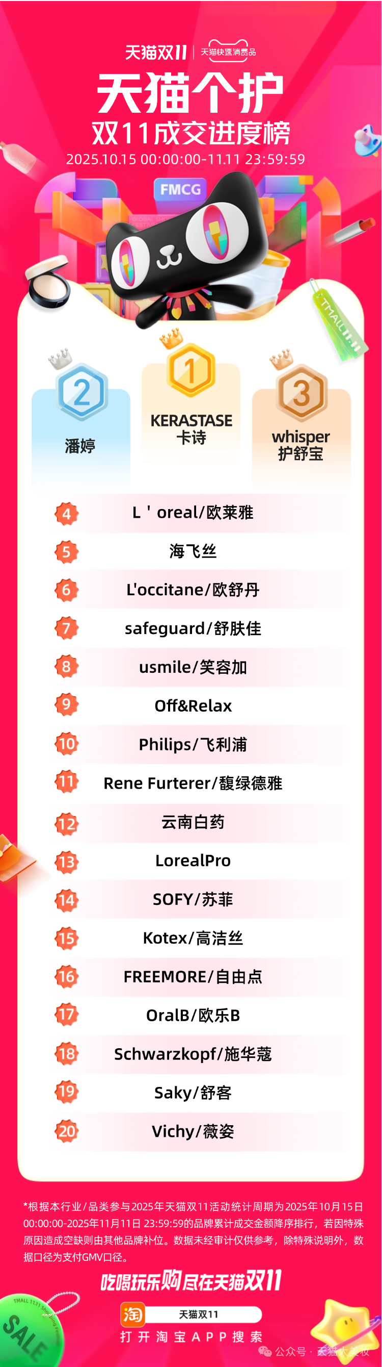 结合今日(11月12日)天猫官方最新发布的美妆双11成交进度榜(2025年10月15日-11月11日),头部阵营呈现“强者恒强”局面。珀莱雅实现“三连冠”,连续三年蝉联第一;雅诗兰黛自2023年起跌出前三后,今年超越巴黎欧莱雅重夺亚军,后者则掉至第四;兰蔻地位稳固,排名第三。