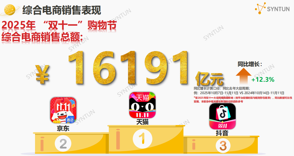 而这也势必为平台带来正向效应。星图数据显示,今年双11综合电商销售总额达16191亿元,同比增长12.3%,天猫、京东、抖音站在颁奖台之上。