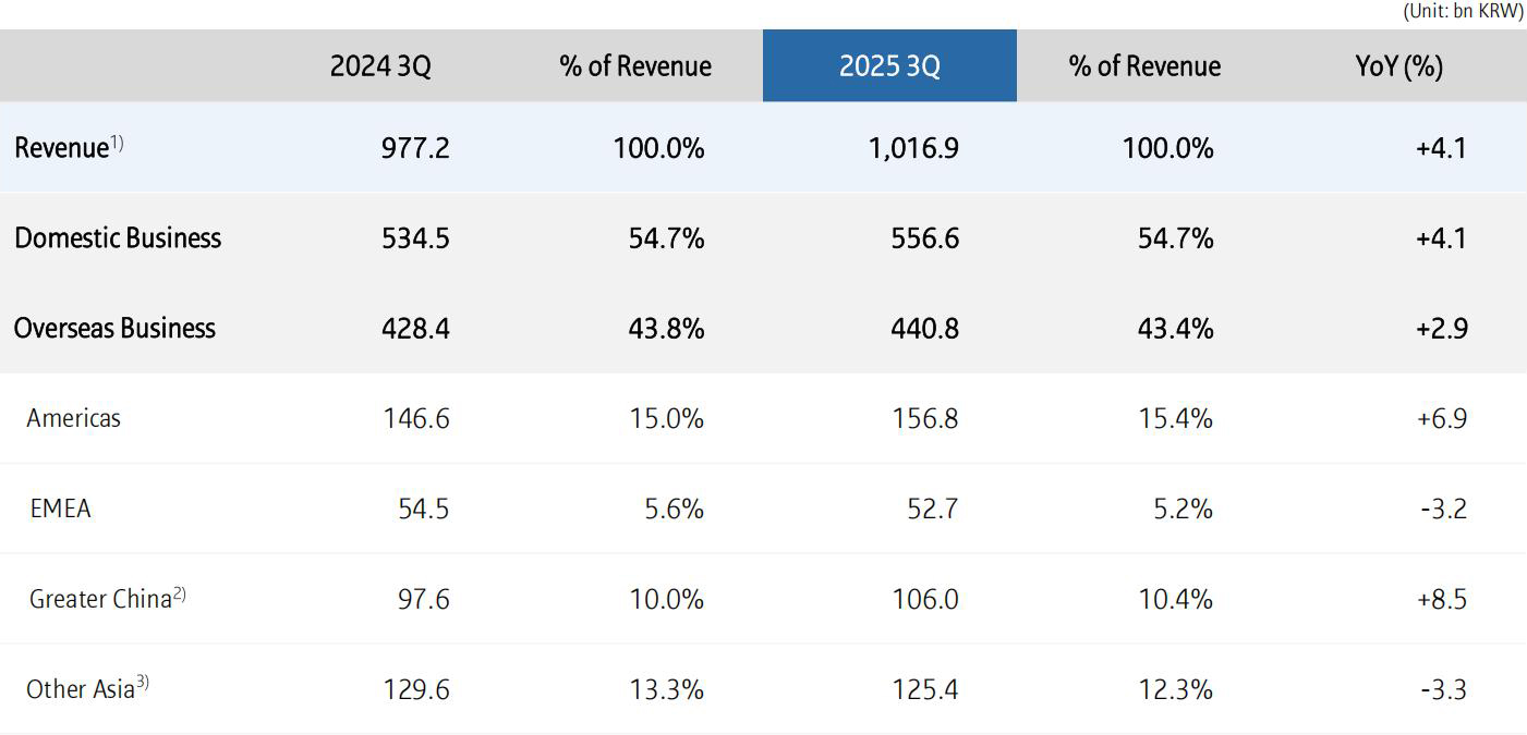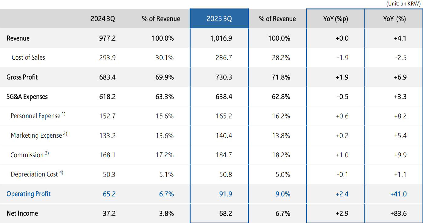 营收稳步增长,利润增速远超营收。第三季度,集团营业利润达到919亿韩元(约合人民币4.5亿元),同比大幅增长41.0%;净利润更是达到682亿韩元(约合人民币3.3亿元),同比飙升83.6%。利润增速远高于营收增速,这表明公司的增长是高质量、有盈利性的增长,而非单纯依靠市场投入拉动规模。