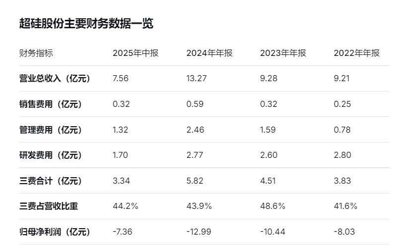 然而,超硅股份近三年半累计亏损38.82亿元。2022年、2023年、2024年及2025年1-6月,公司营业收入分别为9.21亿元、9.28亿元、13.27亿元、7.56亿元。同期,公司归母净利润分别为-8.03亿元、-10.44亿元、-12.99亿元、-7.36亿元。