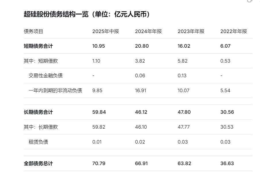 从超硅股份的有息负债看,2022年有息负债还为36.63亿元,到了2025年6月末达70.79亿元,其中长期负债大涨为主因,从2022年的30.53亿元一路涨至2025年6月的59.84亿元。
