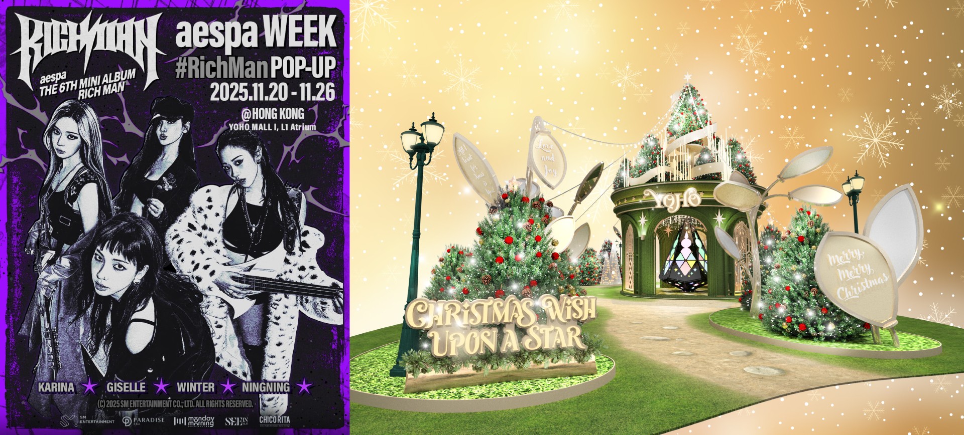 韩流圣诞风暴强势来袭!这个圣诞,YOHO 系商场将于2025年11月20日至2026年1月1日期间呈献「星光璀璨企划」系列!首先由韩国超人气女团aespa「RichMan POP-UP @HONG KONG」快闪店揭开序幕,特别为香港区MYs打造一个以 aespa 全新迷你专辑《Rich Man》为主题设计,融合aespa独特世界观的沉浸式体验空间,点燃节日气氛让MYs与aespa一起缔造最「Rich」的圣诞回忆!