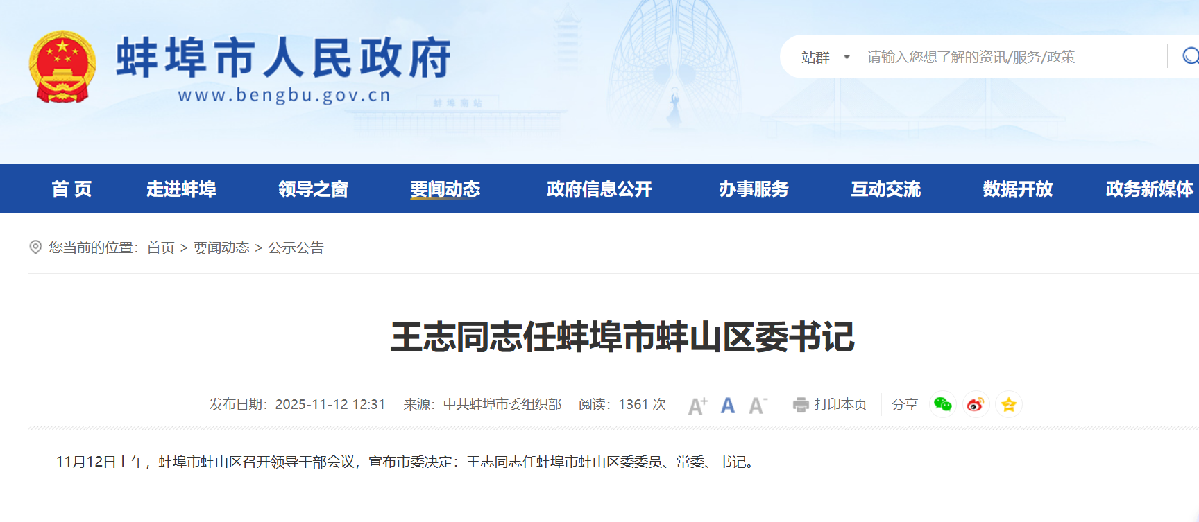 据蚌埠市人民政府网站消息,11月12日上午,蚌埠市蚌山区召开领导干部会议,宣布市委决定:王志同志任蚌埠市蚌山区委委员、常委、书记。