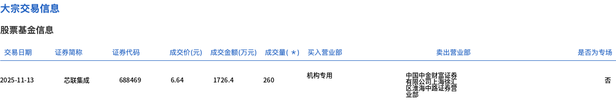 11月13日,芯联集成大宗交易成交260万股,成交额1726.4万元,占当日总成交额的1.17%,成交价6.64元,较市场收盘价6.74元折价1.48%。