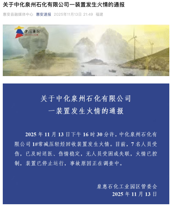 福建泉惠石化工业园区管委会通报,11月13日下午16时30分许,中化泉州石化有限公司1#常减压轻烃回收装置发生火情。目前,7名人员受伤,已及时送医、伤情稳定,无人员受困或失联,火情已控制,装置已停止运行,事故原因正在调查中。