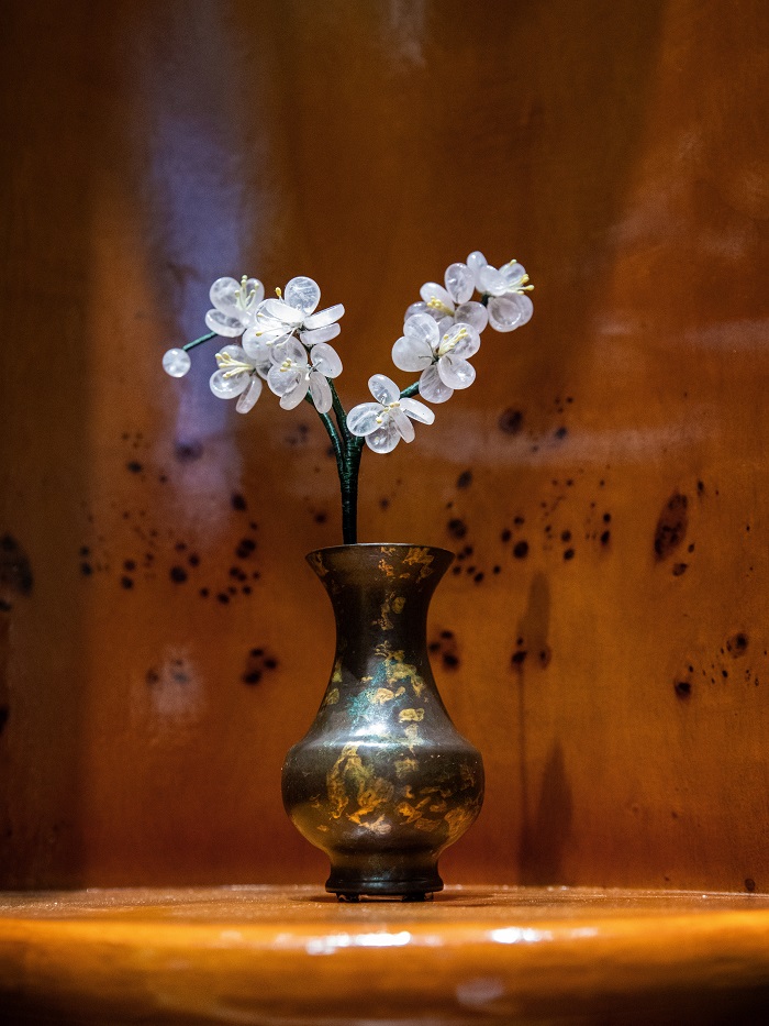 步入店内空间,手绘仙鹤漆画与地面马赛克幼鹤衔珠纹案遥相呼应,可谓俯仰皆景。从隔断式屏风门到柜门把手等,玉瓶元素则大大小小、错落有致地藏嵌于多处细节之中。家居服区,以明黄色麒麟纹样的dedar纺织面料上墙,极具中式韵味的提花与明亮醒目的色彩使得整块区域温暖而不失奢重,与空间内所陈列的宋锦、香云纱刺绣家居服饰等相辅相成。随处可见的插花艺术, 悄然融于店内每处角落,以呈现花的不同形式——几株兰花,室有清香;玻璃辛夷,灼灼其华;玉石瓶花,相得益彰…… 有谓花有百态,美美与共。值此之际,邀你来新店共赏这四时之花,潜入蓬莱一梦。