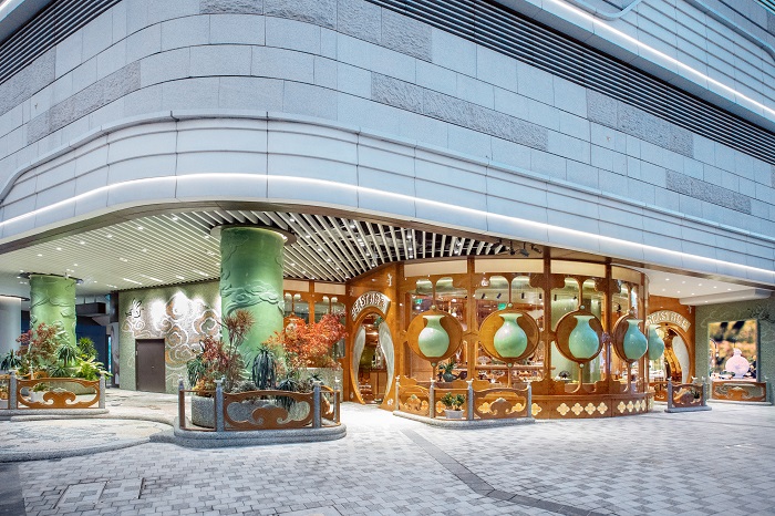 入门处,半开放式园林打破界限,化实为虚,如于曲廊雅轩闲逛,每一处转折都带来新的画面。外立面以鹅卵石为媒,全手工铺就的壁画,一幅闲云悠悠、仙鹤衔珠之景,亦真亦幻;衔接园林与室内空间的半落地环形橱窗外,一排玉石所塑之瓶,集四时风雅,温润如脂。廊内自然花植设计与点缀,使得园林更添生机,如流动画卷,待人寻觅一片雅士心境。
