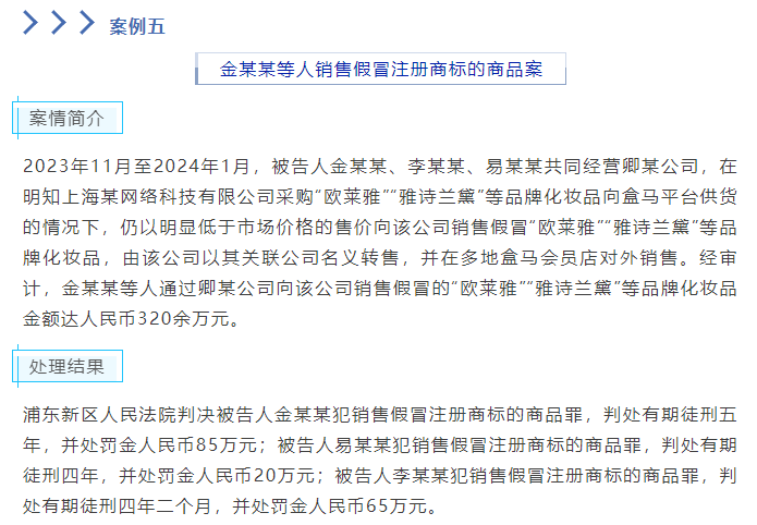 近年来,化妆品侵权判罚力度显著提升。2024年,雅诗兰黛中国就悦木之源品牌侵权胜诉获赔1060万元;在入选“2024年上海知识产权保护十大典型案例”的盒马售假案中,金某某等人向盒马供货320余万元假冒“欧莱雅”“雅诗兰黛”产品,主犯被判处有期徒刑五年并处罚金85万元。
