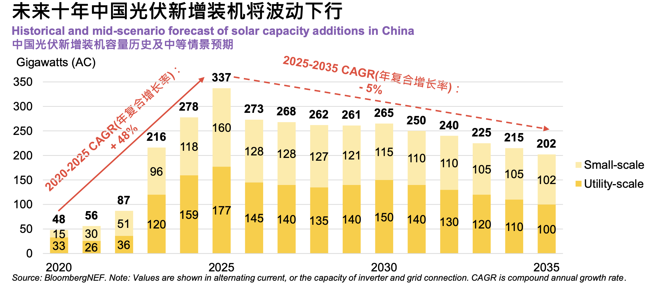 从需求端看,彭博新能源财经判断,今年全球光伏新增装机量将再创新高,达到694 GW,这其中大部分仍由中国引领。中国新增装机将达337 GW,对应的组件需求超过400 GW。