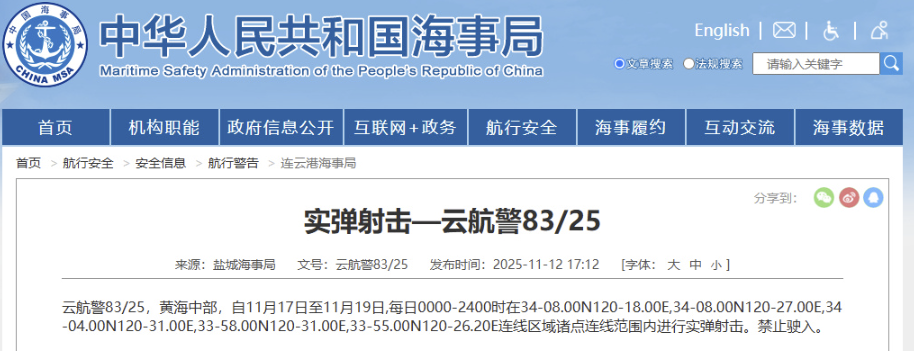 据中国海事局网站消息,盐城海事局发布航行警告,11月17日至19日,每日0时到24时,黄海中部部分海域进行实弹射击,禁止驶入。