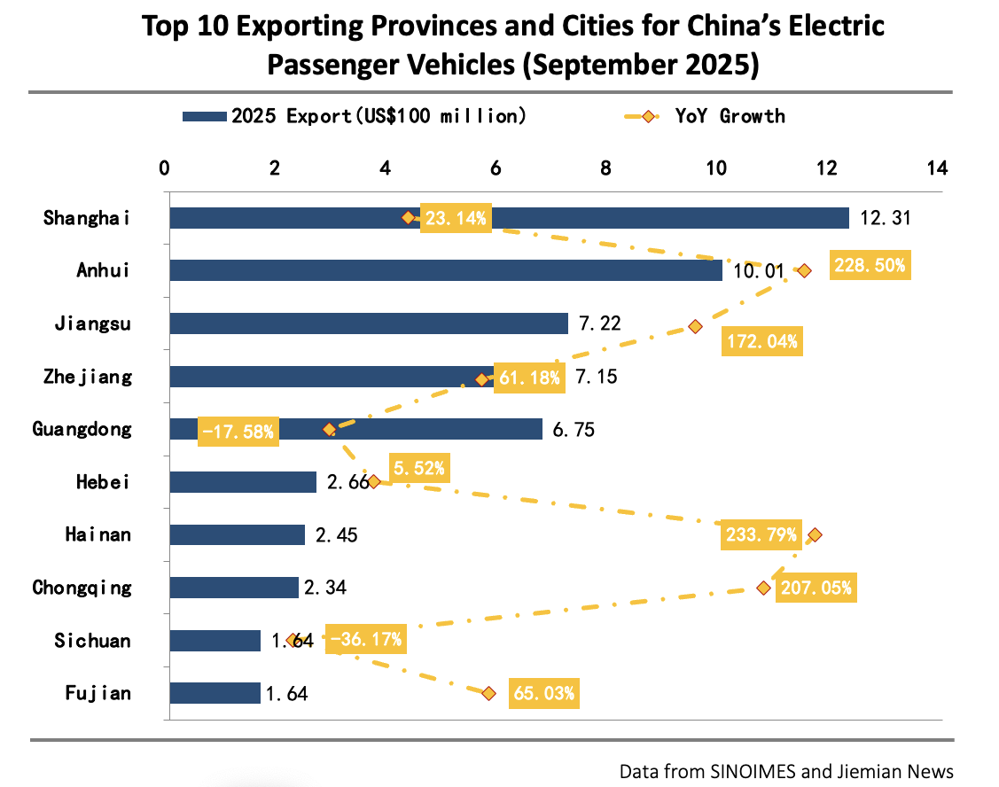 Exports in September totalled US.3 billion, rising 46.91 per cent year on year but falling 10.9 percentage points from August's elevated level. The average export price stood at US,251, around 13 per cent lower than a year ago, suggesting that the "price-for-volume" strategy employed by many carmakers earlier this year is gradually stabilising.