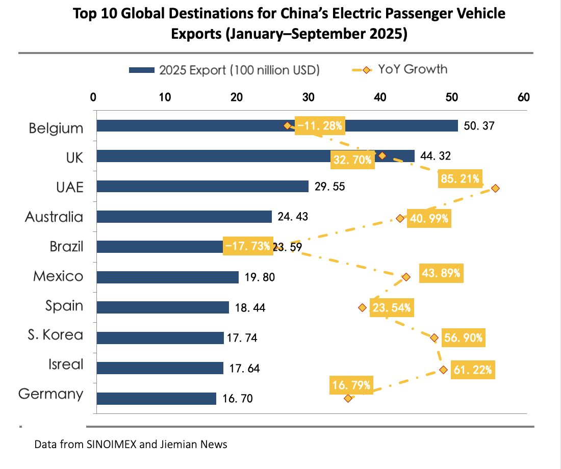 On the demand side, China's top export destinations remained largely unchanged. Belgium, the United Kingdom and the United Arab Emirates continued to rank as the three largest markets, together absorbing more than half of China's electric passenger vehicle exports from January to September. Belgium remained the top destination despite an 11.28 per cent decline, while the UK and the UAE recorded strong growth of 32.70 per cent and 85.21 per cent respectively.