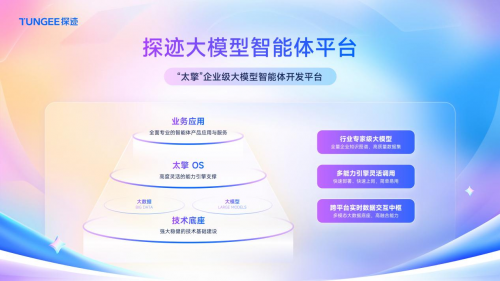 这些高效的数字员工背后,是探迹科技自主研发的“太擎”企业级大模型智能体开发平台与“旷湖”数据云底座所提供的强大技术支撑。这两大平台共同构成了探迹数字员工的核心技术基座,为其高效、精准的业务能力提供了系统化保障。