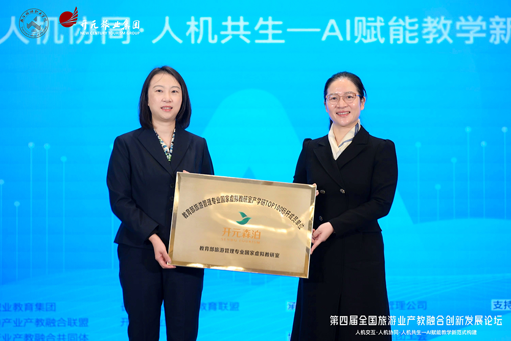 在活动现场,举行了“教育部旅游管理专业国家虚拟教研室产学研TOP100标杆成员单位”授牌仪式。该教研室成员均从全国151所国家一流专业院校中严格遴选产生。首批入选TOP100成员院校的包括安徽师范大学、沈阳师范大学、中南民族大学、福建农林大学、宁波大学等58所高校。而今天,开元森泊作为首站入选TOP100标杆成员单位的企业,在现场接受了这一荣誉授牌。由教育部旅游管理专业国家虚拟教研室秘书长郭田田女士授牌,开元森泊管理公司总经理助理兼人力资源总监陈静女士上台接受授牌。我们衷心感谢教育部旅游管理专业国家虚拟教研室将这一殊荣的第一站授予开元企业,这既是对我们深耕行业的认可,也是对产教融合路径的重要开拓。
