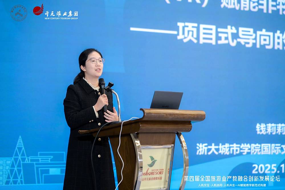浙大城市学院国际文化旅游学院学术副院长钱莉莉女士带来《游戏化虚拟现实技术赋能非物质文化遗产活化传承——基于项目式教学-研发-应用途径》话题的分享并介绍浙大城市学院未来文旅实验室和游戏化虚拟现实技术促进非遗数智活化案例,构建项目式导向的产学研用路径。