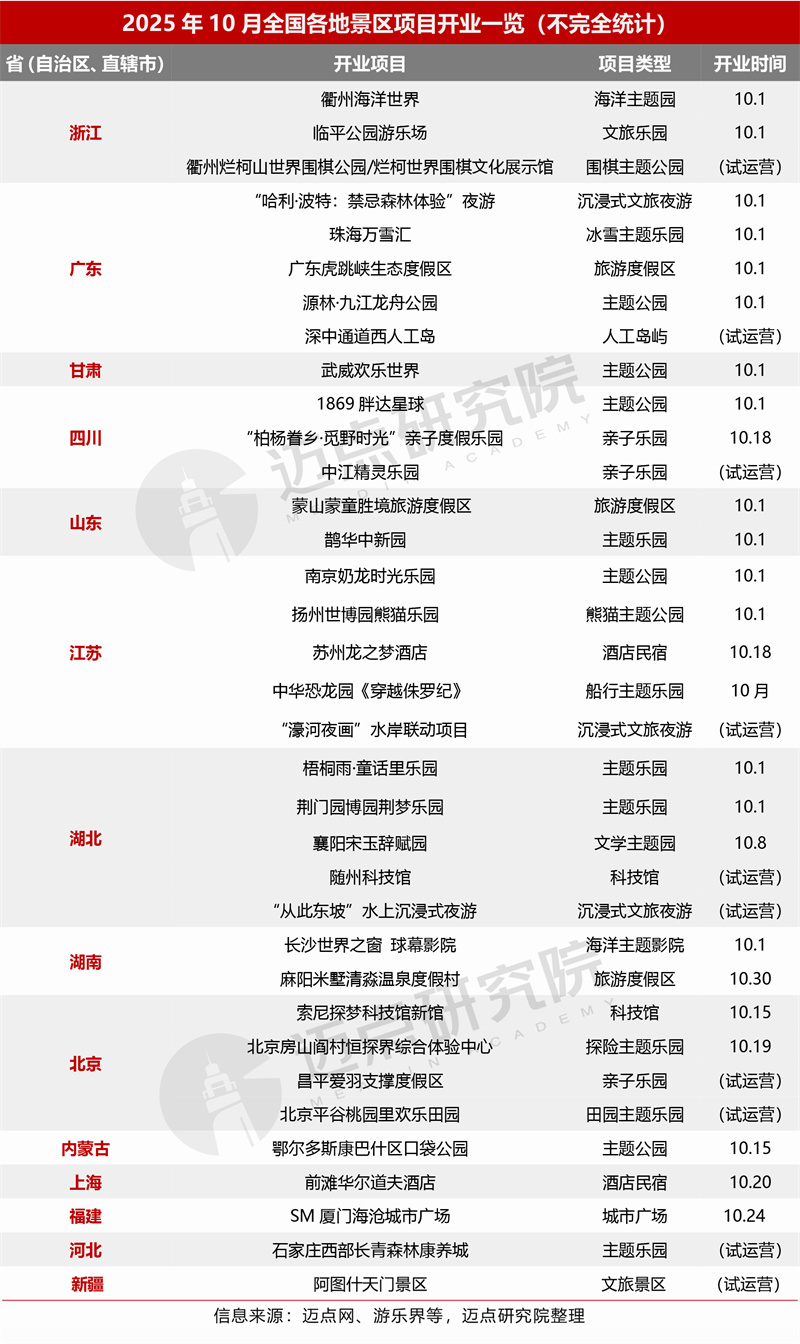据迈点研究院不完全统计,10月新开业文旅景区项目共35个,环比基本保持不变。为抢占国庆中秋假期的市场热度与游客流量,据不完全统计,10月1日当天,有15家文旅景区项目开业迎客,经营表现出色。如以济南鹊山文化园为例,开放首日,入园人数四万余人次,一跃成为济南文旅市场中引人瞩目的“黑马”。