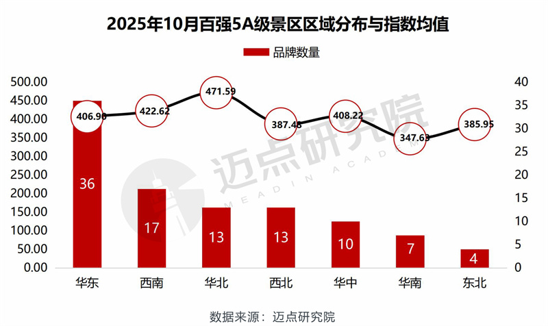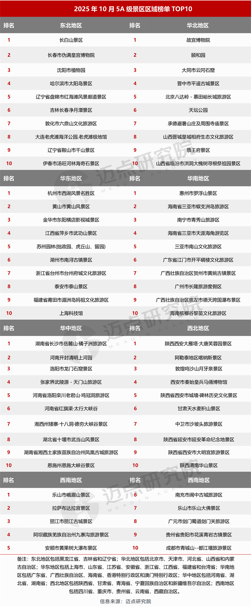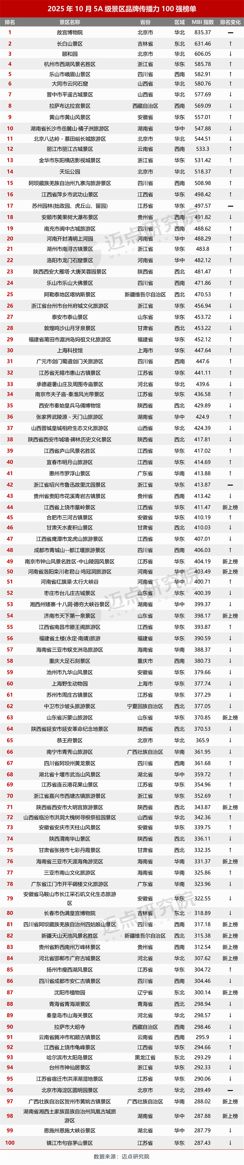 “2025年10月5A级景区品牌传播力100强榜单”数据来源于迈点品牌指数MBI,根据10月迈点品牌指数MBI的359家景区数据汇总统计而成。具体说明如下: