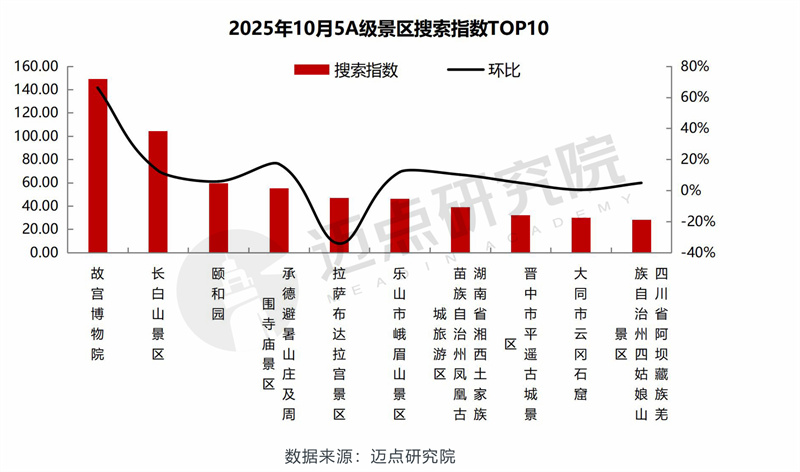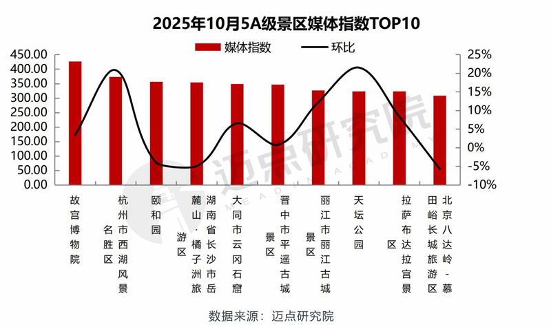 以下是迈点研究院独家发布“2025年10月5A级景区品牌传播力(MBI)100强榜单”。10月,故宫博物院、长白山景区、颐和园、杭州市西湖风景名胜区、乐山市峨眉山景区、大同市云冈石窟、晋中市平遥古城景区、拉萨布达拉宫景区、黄山市黄山风景区、湖南省长沙市岳麓山·橘子洲旅游区位列榜单前十。本月百强景区中,排名环比上升40家、下降42家、4家保持不变、14家新上榜。